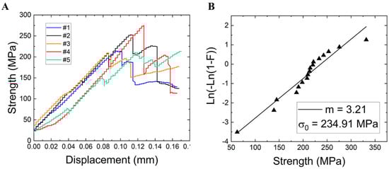 Mechanical data from C/C-SiC composite samples subjected to (A) four-point bend tests (stress versus. displacement) and (B) Weibull statistics.