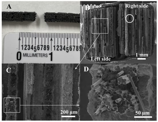 The samples showed similar behavior to that observed in Figure 11. It is evident that no delamination occurred, and most of the failure involved fiber pullout. The macro image in Figure 11A shows the side view of the fracture surface, where no delamination can be observed, and fiber pull out is visible. The side-by-side cross-section view, Figure 11B, shows gaps, as pointed out by a circle, where the tows were either completely pulled out, were not fully consolidated with matrix, or were printed with a small gap leaving the large open area in the fracture surface. Figure 11C shows the area more clearly, where the transverse fiber tows are encased in a material, and the out-of-plane tows show many areas of Cf pullout. Figure 11D shows this pullout, and this is where the high toughness comes from.
