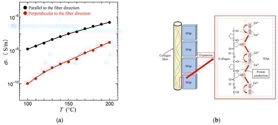 Temperature dependence of proton conductivity parallel to the fiber direction and perpendicular to the fiber direction (a) and proton conductivity pathway in the Hap–collagen composite (b).