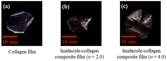 Figure 4a–c show the FT-IR spectra in the imidazole, collagen film, and imidazole–collagen composite film of n = 2.0, respectively. Here, n is the imidazole molecular concentration per collagen molecule (Gly-Pro-Hyp). The absorbances for the collagen film are observed at 1403 cm−1, 1453 cm−1, 1553 cm−1, and 1639 cm−1, as shown in Figure 4b. These absorbances are specific to collagen film. For example, the absorbances at 1639 cm−1, 1553 cm−1, and 1453 cm−1 are known as those of C=O stretching motion, N-H stretching motion, and C-N vibration motion, respectively [40,41]. It is noted that the absorbances at 752 cm−1, and 1063 cm−1, which cannot be observed in the collagen film, are observed with the slight peak shift in the imidazole–collagen composite in Figure 4c. These absorbances correspond to the specific ones in imidazole and derive from C-H out-of-plane bending [36]. In addition, it is also noted that the absorbances corresponding to the ring bending of imidazole observed at around 615 cm−1 and 662 cm−1 are reduced by forming the imidazole–collagen composite film. This result indicates that the ring bending is suspected by binding between imidazole and collagen. It is deduced that imidazole is introduced into collagen and that the imidazole–collagen composite is formed.