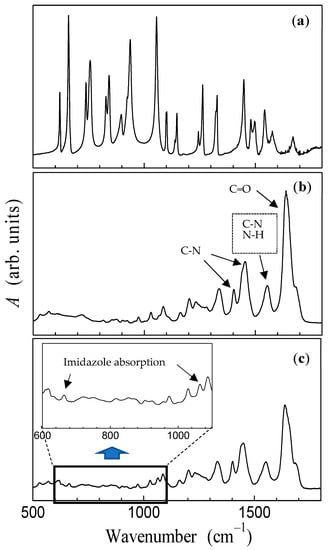 FT-IR spectra in imidazole (a), collagen (b), and imidazole–collagen composite (c).