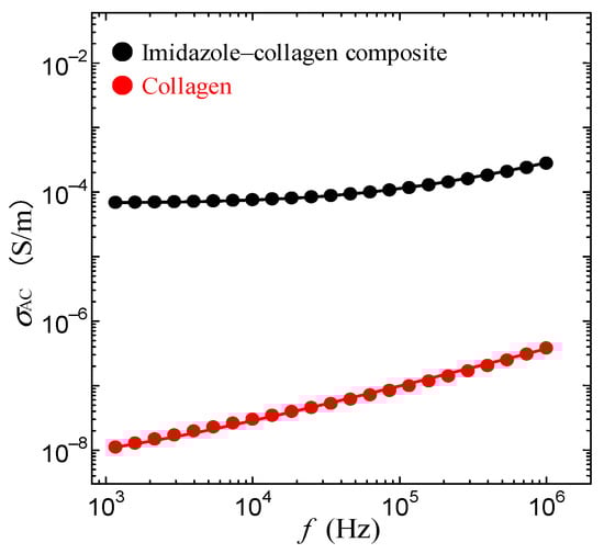 Figure 6 shows the frequency dependence of AC electrical conductivity σAC at 160 °C in the collagen membrane and the imidazole–collagen composite of n = 2.0. As shown in Figure 6, σAC in the imidazole–collagen composite becomes 103 times higher than that in the collagen membrane.