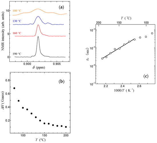 where C and B are the NMR line widths before and after motional narrowing, respectively, and γ and α are the gyromagnetic ratio of the proton and the constant of (8ln2)−1, respectively. Figure 7c shows the temperature dependence of τc calculated using Equation (1). As shown in Figure 7c, τc decreases by increasing temperature. Furthermore, it is noted that the slope of the temperature dependence of τc changes at around 120 °C.
