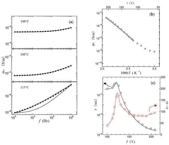 Figure 8c shows the temperature changes in the dielectric relaxation time τ and the static dielectric constant εs-ε∞ calculated using Equation (3). The dielectric relaxation time τ becomes long at around 120 °C and becomes shorter with increasing temperature, as shown in Figure 8c. The static dielectric constant εs-ε∞ peaks at around 120 °C and increases with increasing temperature. As is well known, in the materials that undergo a phase transition, the critical slowing down is often observed due to the strong correlation of electric dipole moment in the vicinity of the phase transition. In this case, the dielectric constant increases, and the dielectric relaxation time becomes long at around the phase transition temperature.