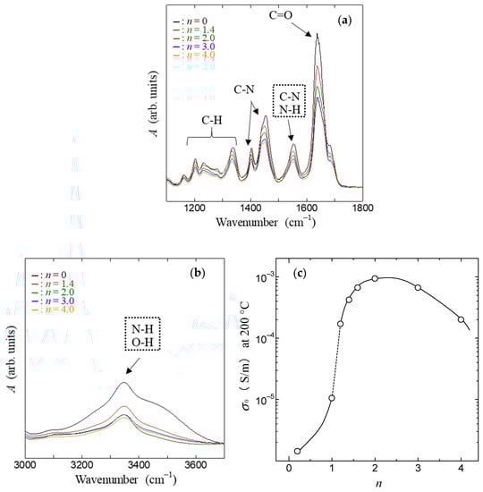 FT-IR spectra and proton conduction in imidazole–collagen composite films with different imidazole contents. (a) FT-IR spectra (500 cm−1 to 1800 cm−1) of imidazole–collagen composite for each imidazole content; (b) FT-IR spectra (3300 cm−1 to 3700 cm−1) of imidazole–collagen composite film for each imidazole contents composite films at different concentrations; (c) the relation between proton conductivity and imidazole content n at 200 °C.