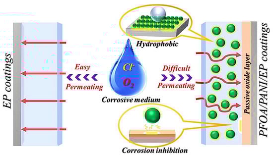 Corrosion protection behavior of epoxy/polyaniline nanoparticle nanocomposite [48]. EP = epoxy; PFOA/PANI/EP = perfluorooctanoic acid-doped polyaniline in epoxy coating. Reproduced with permission from Elsevier.