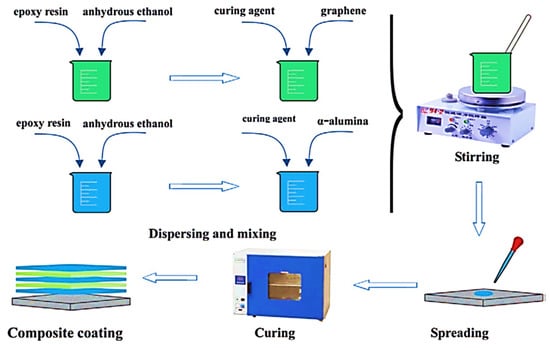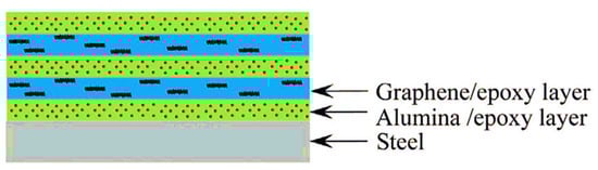 Advanced polymer/graphene nanocomposites have been developed with light weight, inexpensiveness, and fine processability [55]. The nanofiller type controls the anti-rusting properties of metals through coatings [56]. Consequently, graphene has been considered as an important nanofillers in anticorrosion materials [57,58]. The performance and the mechanism of the corrosion resistance material depend on the graphene dispersion, coating thickness, porosity, and formation of circuitous diffusion paths for the corrosive agents [59,60,61]. Using epoxy resin and waterborne polyurethane, efficient anticorrosion coatings were developed in [62,63,64]. The epoxy/graphene-based nanomaterials revealed high toughness, adhesion, thermal stability, and chemical resistivity in addition to anticorrosion [65,66,67]. Similar to graphene, graphene oxide has also been used in anti-rusting epoxy coatings [68]. Graphene and graphene oxide may form a twisting diffusion path to hinder the permeation of corrosive molecules [69]. Zhang et al. [70] designed corrosion-resistant epoxy/graphene nanocomposite coatings. A five-layered epoxy coating was developed by the addition of graphene and alumina (Figure 2).