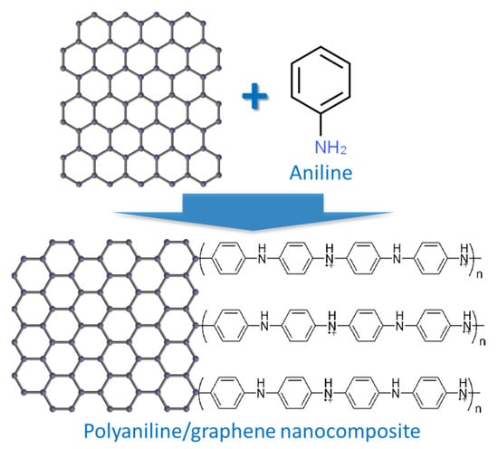 Among conjugated polymers [72], polyaniline has been applied in anti-rusting coats [73]. Kraljić and coworkers [74] industrialized polyaniline/graphene nanocomposite coatings. Figure 5 demonstrates the development of the polymer/graphene coating through the aniline monomer and in situ polymerization [75,76]. Graphene nanoparticle cause a fine dispersion and barrier effect, preventing the infiltration of water/oxygen molecules [77]. Sun et al. [78] formed an anticorrosion pernigraniline/graphene nanocomposite with fine scratch resistance features. The improved dispersion and interaction of graphene nanoparticles with polymers have been studied for nanocomposite coatings [79,80]. In this way, graphene has been combined with both conjugated and nonconjugated polymeric matrices for corrosion resistance properties.