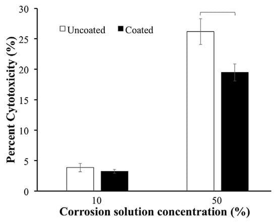 Percentage cytotoxicity of neurons after 24 h exposure to medium (for coated/uncoated sample) corroded over 3 days, analyzed using live/dead staining [100]. Reproduced with permission from Elsevier.