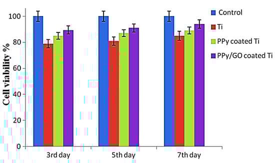 In tissue engineering applications, the worth of polymer/graphene nanocomposites has been recognized [101]. These nanomaterials have received considerable attention regarding their design, biocompatibility, and degradable properties for fabricating the desired biomedical scaffolds. The potential of anticorrosion polymer/graphene nanomaterials can further enhance the stability and efficiency of the engineered bio-tissues. However, further in vivo studies have been found desirable to validate the polymer/graphene nanocomposite scaffolds. Rikhari et al. [102] fabricated a polypyrrole (PPy) and polypyrrole/graphene oxide (PPy/GO) nanocomposite for tissue engineering. The nanocomposite was deposited on Ti metal using electro-polymerization. The corrosion protection efficiency of neat PPy and PPy/GO nanocomposite coatings, as well as their porosity, on Ti metal are depicted in Figure 8. The nanocomposite coating revealed a higher corrosion protection efficiency than the neat PPy coating. The porosity of the nanocomposite coating also displayed the same trend. Figure 9 shows the proliferation assay (MTT) for MG-63 cells on the surface of coated and noncoated Ti metal. A 7 day time interval was allowed for cell proliferation in the presence of PPy and the PPy/GO nanocomposite. The Ppy/GO nanocomposite facilitated the adhesion/proliferation of MG-63 cells without any cytotoxicity or corrosion phenomena. Therefore, the nanocomposite coatings were found to be effective. De Armentia et al. [103] prepared photopolymerizable acrylic resin/graphene oxide nanocomposites as anticorrosion materials for dentistry and tissue engineering applications. The graphene oxide content and number of layers in the nanocomposite determined the corrosion resistance performance of the nanomaterials. In summary, various polymer/graphene nanomaterials have been successfully designed and applied in anticorrosion biomedical tissue engineering applications.