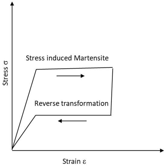 A lot of research effort has been driven toward high-temperature SMAs [14,15]. In addition to smart behavior, these alloys also exhibit good mechanical properties that further increase their scope of utilization. SMAs exhibit another unique property termed superelasticity. Superelasticity (SE) is the property of materials that exhibits large elastic strains (4–8%) and recovers them upon removal of load at the same test temperature without a heating process [16]. As there is no requirement of temperature change and the process takes place in the isothermal regime, the material is termed as superelastic [13]. This effect is attributed to stress-induced martensitic transformation in these alloys upon application of stress/load, where they return to their original phase (austenite) upon removal of stress [17,18]. This property of energy absorption and dissipation can be utilized as impact absorbent material in a number of engineering applications. Equiatomic nickel titanium alloy (NiTi), also known as Nitinol (on account of its discovery at Naval Ordinance Lab USA), is an important SMA on account of its good strain recovery ability, good strength, and corrosion resistance [19]. It is one of the most widely used SMAs in different research areas.