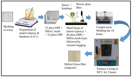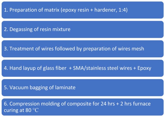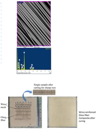 Superelastic NiTi near-equiatomic alloys in the form of wires of diameter 0.3 mm and stainless-steel wires of diameter 0.3 mm, obtained from Ortho Organizers USA, were used in the present research work to manufacture SMA-reinforced FRP hybrid composites and SS-reinforced FRP hybrid composites. Tensile testing of NiTi wires was conducted to analyze their stress vs. strain response. E glass fibers were used as FRPs to manufacture glass-fiber-reinforced composites and in hybrid combination with SMAs and SS. The composition of fibers as obtained from EDX analysis is shown in Table 1. The experimental steps followed are shown in Figure 2 and represented schematically in Figure 3.