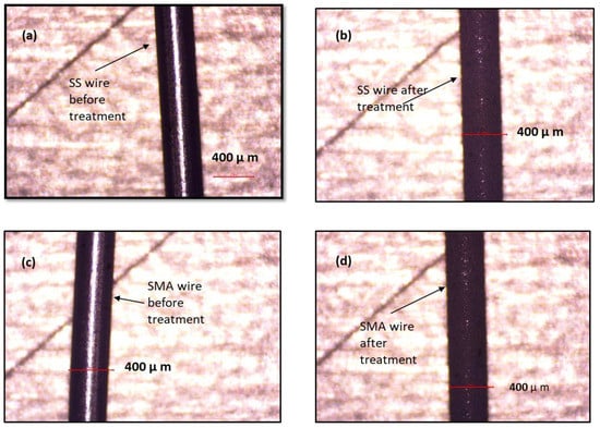 Optical micrographs of the untreated SS wire surface, mechanically treated and ultrasonicated SS wire surface, untreated SMA wire surface, and mechanically treated and ultrasonicated wire surface are shown in Figure 6. The optical microscope used was a Novex Holland with a magnification 1000×. It can be observed that mechanical treatment substantially improved the surface roughness of the wires.