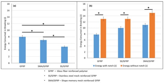 Results of Charpy impact test indicating energy consumed in breaking (toughness) of GFRP, SS/GFRP, and SMA/GFRP composites: (a) set A, with dimensions of 6 mm × 6 mm × 44 mm; (b) set B, with dimensions of 6 mm × 6 mm × 57 mm. At a p value of 0.05, the energy consumed in breaking is significantly different for all samples. The difference in the consumed energy with and without the notch is also significant. * symbolizes the significant difference.
