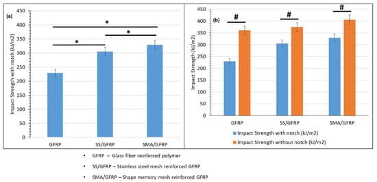 Results of Charpy impact test indicating impact strength for GFRP, SS/GFRP, and SMA/GFRP composites: (a) set A, with dimensions of 6 mm × 6 mm × 44 mm; (b) set B, with dimensions of 6 mm × 6 mm × 57 mm. At a p value of 0.05, the impact strength with the notch is significantly different for all samples. However, the difference in impact strength with and without the notch is not significant. * symbolizes the significant difference and # symbolizes the insignificant difference.