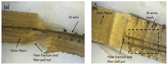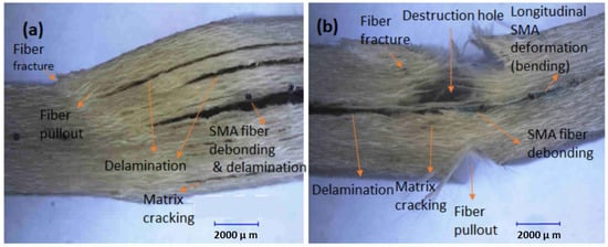 The unnotched composites, i.e., GFRP composites, the SS-reinforced hybrid GFRP composite, and the smart hybrid composite SMA/GFRP, all absorbed more impact energy as compared to the notched samples as there was no stress concentration area around the fracture. For the glass fiber composite, Figure 14a shows that the load was transferred throughout the cross-section of the composite, leading to a V-shaped morphology of the cross-section. The damages comprised matrix breakdown, fiber bending, fiber breakage, and multilayer delamination, all of which showed energy dissipation mechanisms within the composite, but the sample was not broken as was the case of the notched sample. For the SS-reinforced GFRP unnotched sample, Figure 15a, the stainless-steel mesh provided strength to the hybrid composite, propagated as fiber bending and breakage at the point of impact, and delaminated in the fibers and in the plane of the SS mesh. The absorbed energy was greater than that of the glass fiber composite, leading to a greater impact strength of the material. For the case of the SMA-reinforced glass fiber composite, unnotched sample (Figure 16a), the impact energy absorbed was greatest among all composite samples, leading to a greater impact strength of the smart hybrid composite. The damage after impact consisted of matrix breakdown and fiber delamination in different planes including the plane of wire. The wires were plastically deformed after SIM transformation upon absorbing impact energy, but there was no fracture of wires, as shown in Figure 15 and Figure 16. The absorbed energy was due to energy hysteresis of the superelastic shape memory wires that provided overall a greater impact strength to the composite material. The plastic deformation observed in SS wire was greater in the SS-reinforced GFRP composites as compared to SMA wires as SMAs underwent phase transformation to stress-induced martensite, which can be observed in the plateau region of the stress–strain curve of SMAs, in Figure 10. Thus, SMA hybrid composites improve the damage resistance of the composites, as discussed in [48].