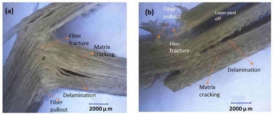 To study the effect of the notch on the fracture mechanics and energy absorption during impact, specimens were prepared with and without the notch. The notch acts as a stress generator region and provides a crack initiation point, and the strength of the composites with flaws can be computed. It helps to study the influence of flaws on the impact strength of composite materials. These defects can reduce the strength of the composites and affect their performance. Thus, the impact strength is determined with notches to study the fracture toughness to predict the life of materials in service with in-built flaws. In addition, the ASTM standards compute impact damages with notches. The impact strength of the composite specimens without the notch shows the total energy absorbed without any stress generator, so the crack propagation path is not defined. However, the flaws in the composite or interfaces may act as stress generators in this case. In a study, Backlund [39] introduced a Damage Zone Model for notched composite laminates using finite element analysis to analyze the stress peak at the notch and damage at the stress region, i.e., the edge of the notch. Eriksson et al. also developed a Damage Zone Criterion model based on the assumption that a homogeneous damage zone grows at the notch tip, perpendicular to the direction of force [40,41]. This fracture profile can be observed in the cross-sectional fracture images in Figure 11b, Figure 12a, Figure 14b, and Figure 15b, respectively. It can also be observed from Figure 14, Figure 15 and Figure 16 that the fracture mode for unnotched composites was mostly delamination, while for the notched composites, fiber fracture and fiber pullout were dominant along with the delamination propagation. Thus, more fracture mechanisms were activated in the presence of the notch due to stress concentration at the notch tip.