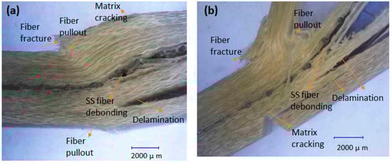 The samples of set B were affected by the impact, resulting in deformation and fracture. In set B also, wires were deformed, showing impact energy absorption unlike set A that hardly showed any effect of impact on wires. Various fracture mechanisms were observed in set B, i.e., matrix cracking, delamination, fiber pullout and fiber fracture, and wires deformation, as depicted in the optical micrographs. In Section 3.1.2, the effect of the notch was also determined for set B, which is discussed below.
