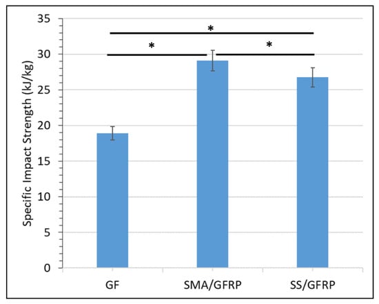 Specific strength of GFRP, SMA/GFRP, and SS/GFRP composites. At a p value of 0.05, specific impact strength is significantly different for all samples. * symbolizes the significant difference.