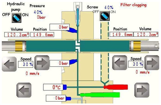 The RMX process, developed by the company Scamex, is an original concept for mixing multiphase products. This device can also promote chemical reactions evolving towards high viscosities, including the presence of very volatile reagents, and therefore operate as a polymerization reactor. Its principle (Figure 2) is based on alternating flow of liquids, mixed through a static mixing element [31]. As shown in Figure 2, a mixing unit consists of an extrusion screw (L/d = 300/20), two cylindrical chambers (Φ = 32 mm) separated by the static mixing element (L = 20 mm, Φ = 3 mm). Two pistons push (hydraulically) the material alternately from chamber to chamber through the mixing element. The operating conditions are then defined by the number of cycles (piston back and forth), the pressure exerted by the pistons on the material in the chambers, and the diameter of the material outlet.
