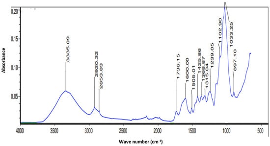 The peak at 3347 cm−1 corresponds to the O-H group whose characteristic vibration is the elongation of the hydrogen bond of the hydroxyl group in polysaccharides;