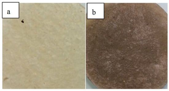 Figure 5. Visual appearance of the plasticized starch (TPS) obtained by RMX: (a) 145 °C, (b) 160 °C.