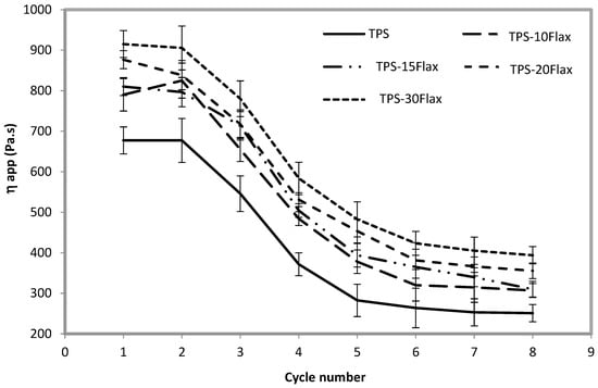 Figure 6. Variation in the apparent viscosity of the TPS mixtures (% percentage) flax shives as a function of the number of cycles (temperature 145 °C).