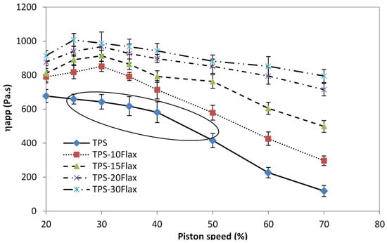 Figure 7 shows the effect of shear rate on the viscosity of starch-based blends. Note that at low speed (<40%) the mixtures are very viscous. The higher the content of flax byproducts, the higher the viscosity [4]. Beyond 40%, the viscosity of the mixtures decreases considerably, which reflects good homogeneity, better dispersion of flax shives and probably good reorientation of the macromolecular chains. However, the addition of flax byproducts gradually results in a considerable increase in the viscosity of the blends. This is mainly due to the restriction of the mobility of the TPS channels.