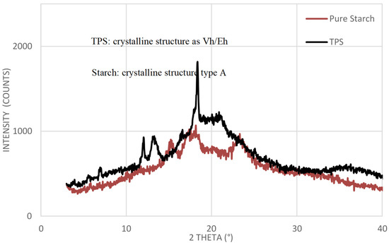 Figure 8 shows the XRD spectrum of native starch and plasticized starch. For native starch, we note that the main diffraction peaks appear at different positions (2θ = 15.2°, 17.2°, 18.1°, 20.1°, and 23.1°). Therefore, and according to Kawabata [18], we can deduce that the native starch has a type A crystal structure. This result seems quite logical since it is a starch of the cereal type. For the TPS, it can also be observed that, under the combined action of the thermomechanical treatment and the plasticizer, the profile of the diffractogram is completely different from that obtained for the native starch. We mainly note the appearance of new diffraction peaks, (2θ = 7°, 12°, 13.5°, and 18.5°) and consequently, an evolution of the type A crystal structure for native starch to an Eh/Vh type structure for plasticized starch. This confirms that the destructuring of the starch took place due to the strong shear exerted by the pistons of the RMX on the material. It should be noted that the Eh structure is slightly stable and is likely to evolve over time to transform into a type Vh structure [27].