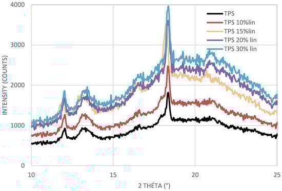 However, the addition of flax fibers, especially in high proportions, seems to affect the microstructure of the plasticized starch (Figure 9). Indeed, it seems that the intensity of the peaks (2θ = 15.2°, 17.2°, 18.1°, and 20.1°) tends to increase. These variations may be indicative of a change in the crystalline microstructure of plasticized starch-based biocomposites. Similar observations have been reported for plasticized starch based on cellulose fibers [18] and based on jute and kapok fibers [20] and the crystallinity of these mixtures markedly increased. However, for TPS-10Flax, the DRX spectrum appears to be unchanged and hence the crystallinity of the plasticized starch as well.