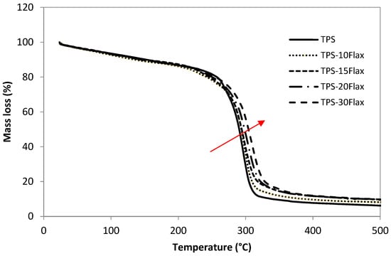 For biocomposite materials and more particularly those with low proportions of flax (10 and 15%), the profile of the mass loss thermograms (Figure 11) is similar to that obtained for the TPS and the decomposition temperature remains almost unchanged. On the other hand, at high proportions of flax (20 and 30%), there is a slight increase in the decomposition temperature (inflection point) of the plasticized starch/linseed shives mixtures and consequently the thermal stability of the biocomposite TPS/flax shives is improved. This result can be explained by the presence of lignin which is characterized by excellent thermal properties (lignin degradation temperature of around 450 °C).