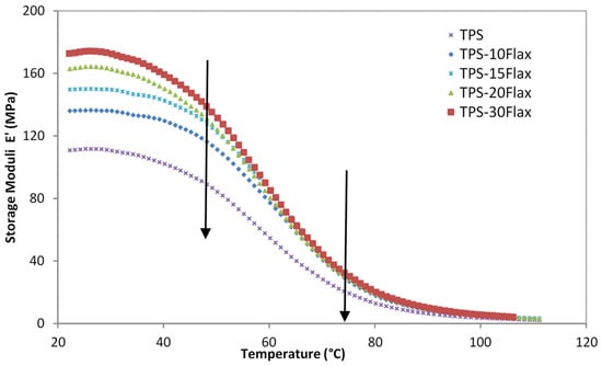Figure 12 shows the variation in the storage modulus (E′) of plasticized starch (TPS) and TPS/flax shives as a function of temperature. On this graph, there are three zones: glassy zone (20 to 45 °C), glass transition zone (40 to 80 °C), and the rubbery zone (above 80 °C). Note that the storage modulus (E′) of TPS gradually decreases with increasing temperature. However, the addition of flax shives contributes to improving the viscoelastic behavior in the glassy domain; therefore, the stiffness of the biocomposite mixtures is higher than that of TPS. The positive effect of flax shives is clearly identified in the vitreous region (20 to 80 °C). Above 80 °C, the contribution of flax shives is less visible and the storage modulus (E′) of the biocomposites are greatly influenced by the softening of the polymer.