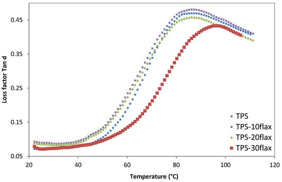 We also note, for the TPS, a main relaxation at T = 82 °C which corresponds to the glass transition temperature (Figure 13). Similar observations have also been reported [35,36,37]. However, the addition of flax shives causes a decrease in the intensity of the tan δ peak and a very slight shift of the glass transition temperature towards higher values. This is even more observed with high proportions of flax shives (30%).