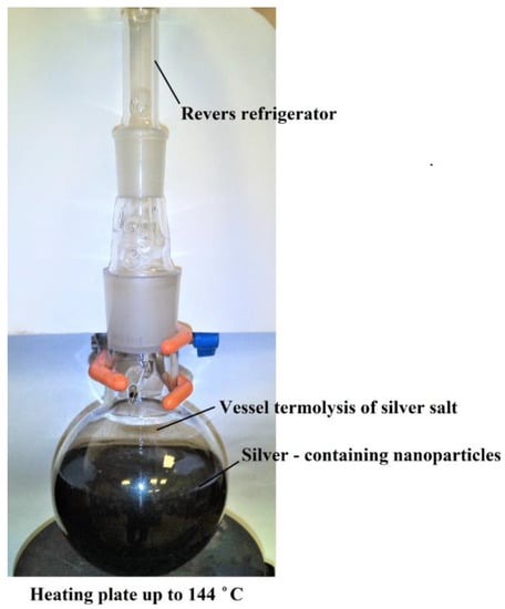 In the case of thermolysis in xylene, a weighed portion of silver maleate was placed in a flask with o-xylene, a reflux condenser was attached, and maintained at the boiling point of xylene (144 °C) for 8 h (Figure 1). The thermolysis product was separated using a porous plate under vacuum, washed with three portions of hexane, 50 mL each, dried first in air and then in vacuum at 80 °C for 6 h. Thus, a black powder was obtained. IR spectrum, cm−1: 3420, 1608, 1542, 1382, 768, 631, 620. Elemental analysis, %: C—15.63; H—2.67; Ag—69.74; O—11.96.
