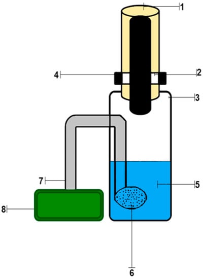 The working solutions were placed in a setup for dynamic gas extraction, shown in Figure 2. It consisted of a glass vessel for the analyzed solution (3) closed with a rubber stopper (1), inside which there was a test strips holder (4) with a clamped test strip (2), an air microcompressor (8) connected to a glass bubbler (6), soldered into the vessel, with a polymer hose (7). Then, the solutions of potassium permanganate and sulfuric acid were added to the working solutions. A Hailea Aco-6601 microcompressor was used to pump air through the reactive system under laboratory conditions. The strips were removed and scanned using Canon CanoScan LiDE 210 (Canon) against a white background at 300 ppi. The scanned images were processed in Adobe Photoshop 7.0 in the RGB mode by averaging the RGB color coordinates of individual pixels within a circular reactive zone.