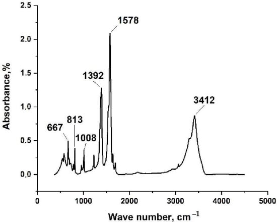 In this study, silver maleate was obtained through the direct interaction of silver nitrate with maleic acid by mixing their aqueous solutions in an alkaline medium. FT-IR, TGA, and DSC were first used to confirm the structure of silver maleate. In the IR spectrum of silver maleate (Figure 3), the band at 3412 cm−1 corresponds to crystallization water; the bands at 1392 and 1578 cm−1 refer to symmetric and asymmetric vibrations of the carboxyl group. The obtained value Δν is 186 cm−1, which may indicate a bidentate method of coordination of the metal-carboxyl group bond (C2ν symmetry) [,].