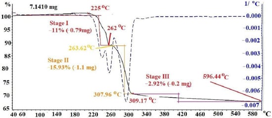 The thermogram of silver maleate is shown in Figure 4. Thermal evolution proceeds in three stages. At the first stage, a weight loss of 11% is observed in the temperature range of 225–262 °C (red line). The decrease in weight can be explained by the dehydration of the compound, which agrees satisfactorily with the theoretical calculation (9.8%). The second stage begins almost immediately after the dehydration stage and proceeds in the temperature range of 263.2–307.96 °C. At this stage, intense gas evolution is observed and an impression of the formation of a “boiling solid layer” is created in the vessel, accompanied by an explosive release of a part of the thermolysis product in the temperature range of 290–300 °C. The weight loss at this stage of thermolysis is 15.93%, which is explained by complete decarboxylation and also satisfactorily correlates with the theoretical calculation (15.27%) (yellow line). The third stage is associated with deep destructive processes and is characterized by an insignificant weight loss (2.92%) in a wide temperature range of 309–600 °C (pink line).