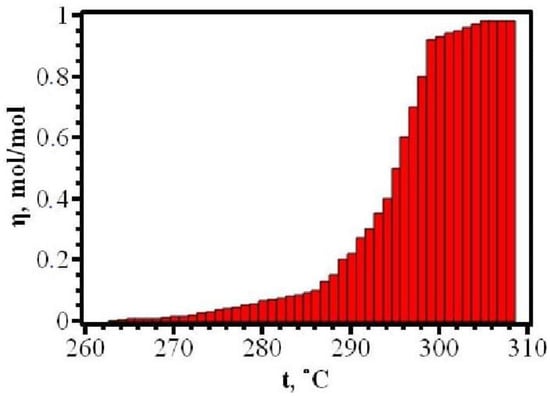 The dynamics of changes in the degree of carbon dioxide conversion during thermolysis is shown in Figure 5. When the sample is heated in the temperature range between 263 and 286 °C, a relatively slow evolution of gas occurs, which corresponds to no more than 10% of the thermal destruction of the substance. In a very narrow range, between 288 and 298 °C, an explosive release of carbon dioxide occurs, corresponding to the decomposition of almost 80% of the initially taken substance, and then, again, a low intensity of gas release is observed.