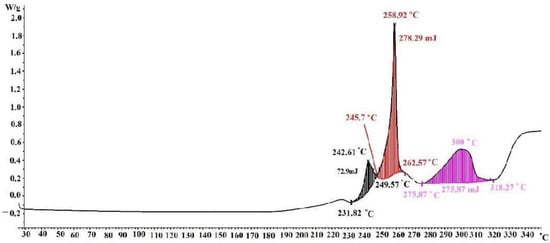 Three peaks are observed on the DSC curve (Figure 6). The first peak was recorded in the temperature range of between 231.82 and 249.57 °C. It reaches its maximum at 242.61 °C and has a mixed character: starting from an endothermic effect, the peak turns into an exothermic effect, characterized by a small thermal value of 72.9 mJ. The first peak almost immediately passes into the second peak, for which an exothermic effect is observed. The beginning of the peak was recorded at a temperature of 245.7 °C, the maximum at 258.92 °C, and the end at 262.57 °C. It should be noted that the second peak is pronounced. The thermal effect is 278.29 mJ. The third section of the DSC curve can be characterized as a wide, but slowly developing, exothermic effect with a rather pronounced heat balance of 278.29 mJ. It starts at 275.87 °C, reaches its maximum at 300 °C, and ends at 318.27 °C. According to its characteristics, it coincides with the second stage of thermal destruction of silver maleate.