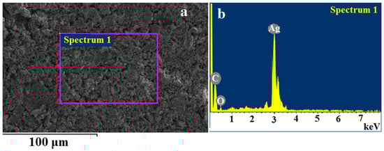 Energy dispersive analysis data for the thermolysis product of silver maleate. (a) spectrum removal area, (b) EDX spectrum.