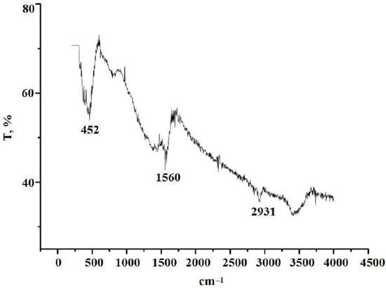 In the IR spectrum (Figure 8), there are two low intensity peaks in the region of 2931 and 1560 cm−1 and a peak of medium intensity at 452 cm−1. Vibrations in the region of 2931 cm−1 may correspond to the stretching vibrations of the C–H bonds in the aromatic systems. The doublet of bands in the region of 1560 cm−1 characterizes the vibrations of C–C bonds in the aromatic system [,,].