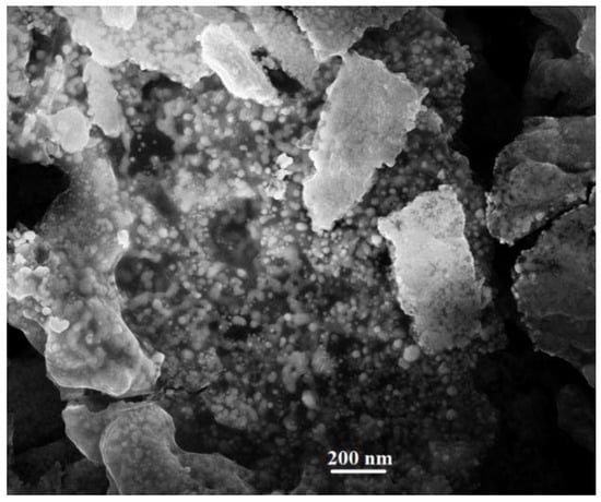 The SEM image (Figure 9) visualizes both free-lying and in a carbon-containing matrix silver particles, mostly spherical in shape, 6.5–82.4 nm in size.