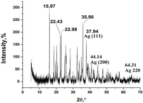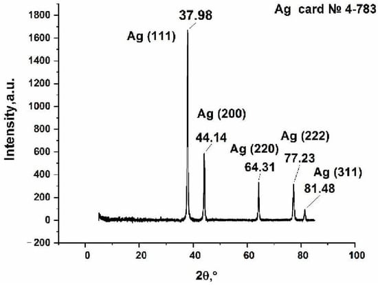 An analysis of the XRD spectrum (Figure 14) shows a greater number of peaks than in the solid-phase thermolysis product, which suggests the presence of crystalline structures that are products of incomplete thermolysis, as well as the presence of graphitized carbon. The size for silver crystallites, calculated by the Debye-Scherrer formula, is 27.4, 33.7, and 45.4 nm.