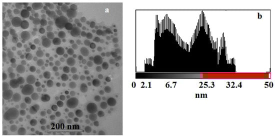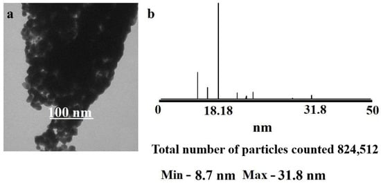 The product of the solid-state thermolysis of silver maleate was studied using TEM (Figure 11a). The TEM image visualizes spherical silver particles located in the stroma of the carbon material. The particle size of silver is between 2 and 32 nm. The particle distribution histogram is shown in Figure 11b.