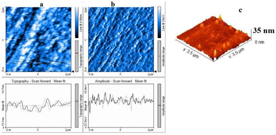 The thermolysis product of silver maleate was additionally analyzed by AFM (Figure 12). Topographically, silver particles are located relatively evenly in the object, the amplitude during scanning in a given direction allows us to state that the particles have a shape closer to spherical, while some of the large particles, about 30 nm, are aggregates of smaller particles formed during thermolysis.