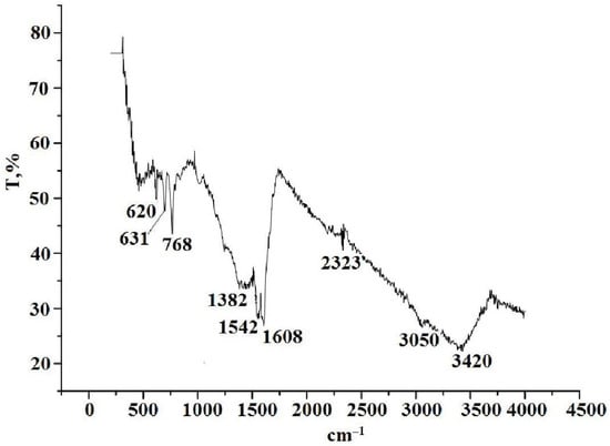 In the IR spectrum of thermolysis product of silver maleate in xylene (Figure 13), there is a wide band of crystallization water at 3420 cm−1, two low intensity peaks in the region of 3050 and 1542 cm−1 and a peak of medium intensity at 620 cm−1. Vibrations in the region of 3050 cm−1 may correspond to stretching vibrations of C–H bonds in aromatic systems. The doublet of bands in the region of 1542 cm−1 characterizes the vibrations of the C–C bonds in the aromatic system [,,].