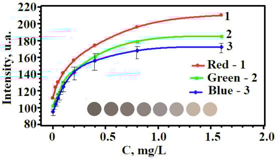 A change in the color can be monitored by an ordinary scanner in the native RGB color space to construct a calibration curve for the determination of iodide content. The graphical dependence of the R-, G-, B-coordinates on the concentration of iodides has the form of an increasing exponential (see Figure 16) and is described by the equation [].