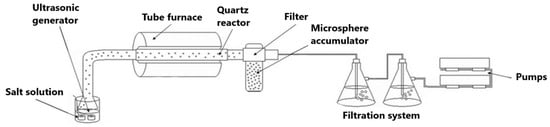Hollow copper (II) oxide microspheres were synthesized by an ultrasonic spray pyrolysis method developed by the authors. The synthesis unit consists of a glass vessel, high-frequency ultrasonic generators, a tubular furnace, a quartz reactor, a filter for collecting samples, and pumps (Figure 1). This method of particle synthesis makes it possible to obtain hollow microspheres with a diameter of 0.5 to 10 µm, which consist of nanosized particles less than 30 nm. Previously, the authors have successfully synthesized similar hollow microspheres based on nickel oxide [35].