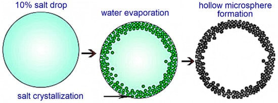 The principle of microsphere production was in pyrolysis of copper (II) nitrate solution in the form of an aerosol in a high-temperature reactor. High-frequency ultrasonic generators with a frequency of 22.4 kHz were immersed in a vessel with a 10 wt.% solution of copper (II) nitrate. The ultrasonic treatment produced a dispersed aerosol of copper (II) nitrate solution. The amount of solution was kept constant to produce microspheres with a minimum size distribution. The aerosol generated by ultrasonic generators was drawn into the furnace reactor at a rate of 16 liters per minute through nozzles by air pumps. Filtered air was used as a carrier gas. The temperature inside the reactor was 1000 °C. Under the high temperature, on the surface of the drop of salt solution a salt layer was formed and then decomposed with the formation of oxide. A schematic representation illustrating the principle of hollow copper (II) oxide microspheres formation is shown in Figure 2. From the reactor, the heated mixture passed through a filter that separated the obtained oxide particles from the gas stream. The gases formed during pyrolysis were removed further. To neutralize aggressive gases, a system of flasks partially filled with water was used. Aggressive gases passing through the filtration system with water flasks formed diluted acid. The remaining gas mixture was then pumped out.