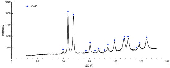 According to the obtained X-ray diffractogram of the microspheres’ sample based on copper oxide, the presence of a phase corresponding to the chemical composition of copper (II) oxide CuO was found (Figure 3). In addition, a significant widening of the maxima was observed, which could indicate a small size of the coherent scattering regions.